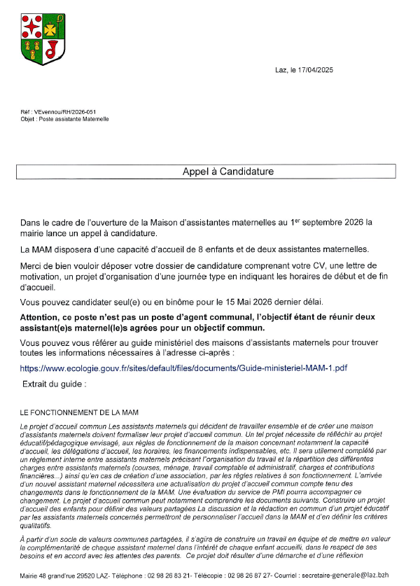 au 1er septembre 2026, la Mairie lance un appel à candidature (jusqu’au 15 mai).