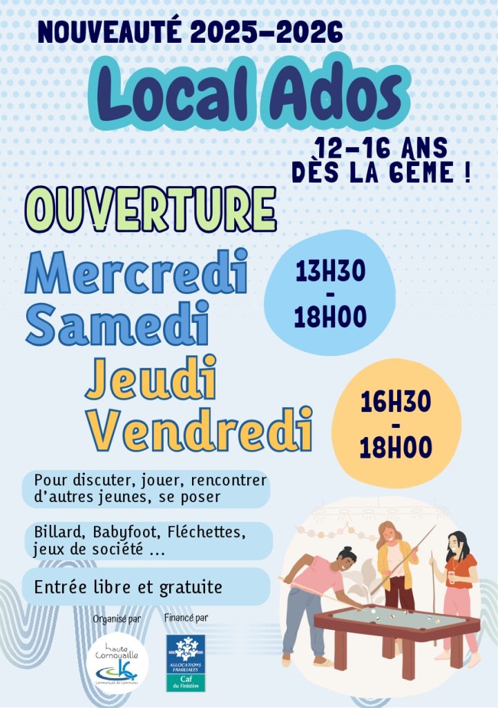 La Communauté de Communes de Haute Cornouaille ouvre un Local Ados, un espace pour les jeunes dès la 6ᵉ pour se retrouver, discuter, jouer, … ou tout simplement passer un bon moment entre amis !